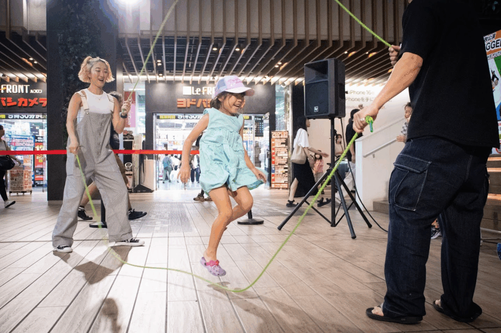 「ダブルダッチって知ってる?」「やったことあるよー!」という会話から、ものの数秒でロープを取り出し子どもたちを跳ばせるFD!